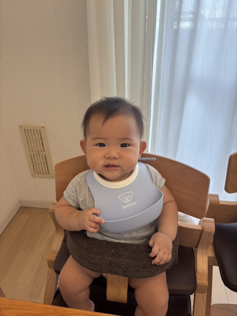 ベビーシートにホールドクッションを付けているので安定して座ってくれていますね。
