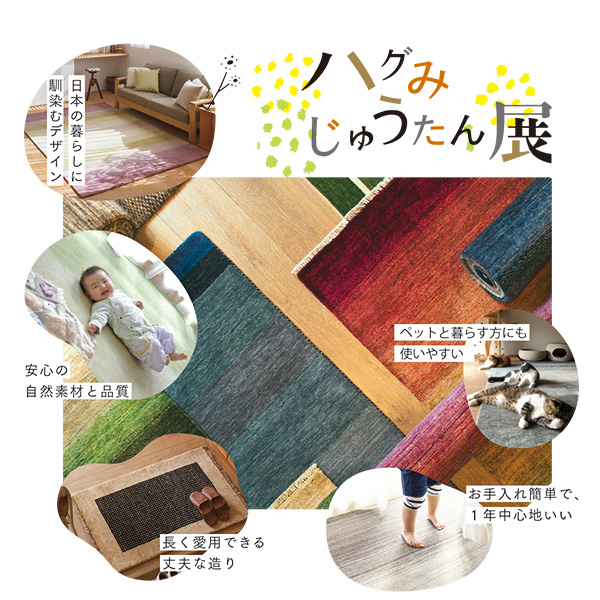 ハグみじゅうたん展では色柄も豊富なハグみじゅうたんの中でも当店がセレクトしたラインナップを一同にご覧いただけます。