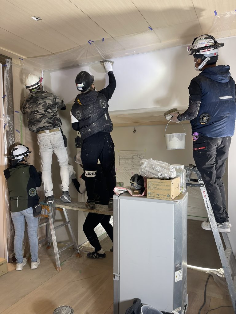 2人が塗装して残りの4人でガーゼで叩いて仕上げていきます。